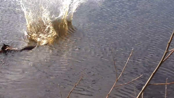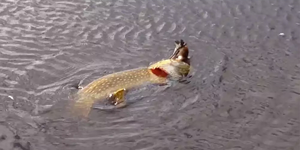 물새 논병아리를 잡아먹는 거대 강꼬치고기의 모습이 포착됐다.