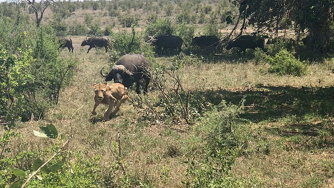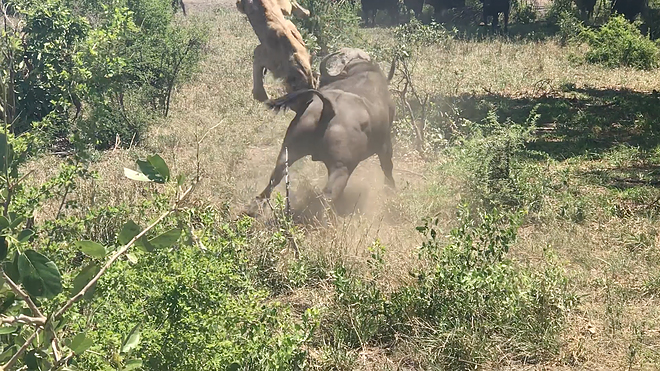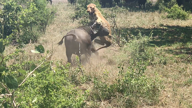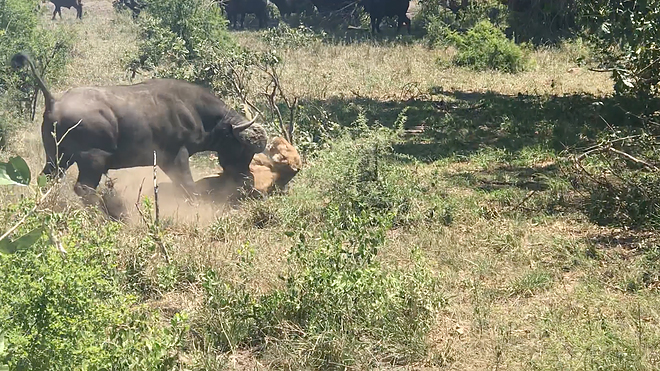 이 같은 장면을 촬영한 배타블 샤퀸(22)은 “암사자 한 마리가 건강한 들소에 의해 집어던져졌다”면서 “굶주림으로 인해 깡마른 암사자가 결국 기아로 죽었을 것 같다. 비극적이고도 놀라운 상황이었다”고 전했다.