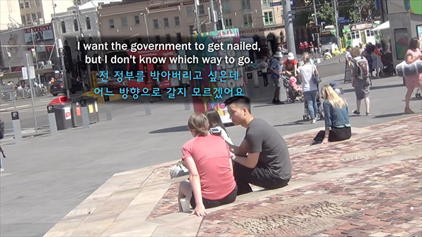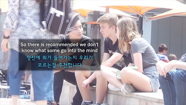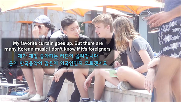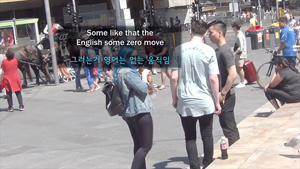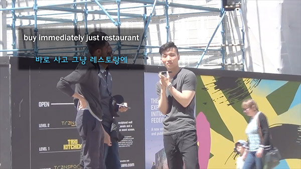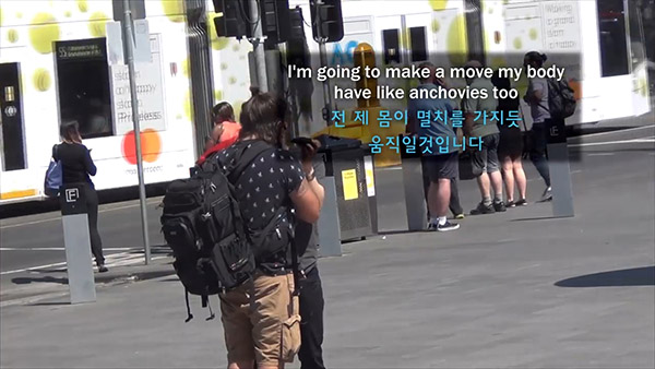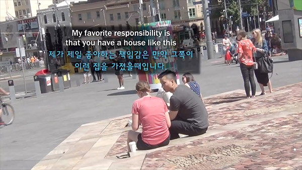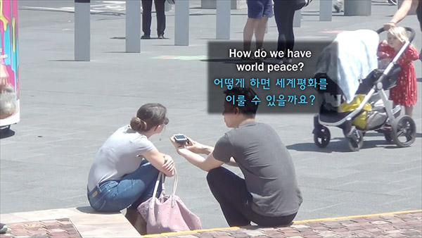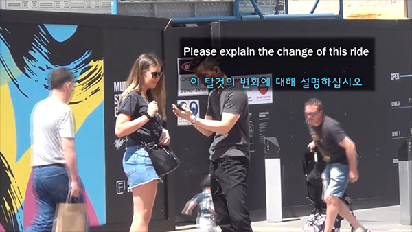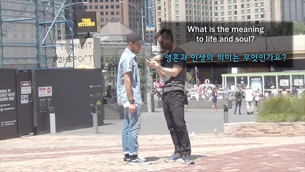 그는 “제가 빵을 먹고 싶은데, 어딜 가야 하죠?”, “제가 몸이 멸치여서 운동을 해야 하거든요”, “제가 문학을 전공하고 싶은데 어느 대학을 가야 되죠?”, “‘피타고라스의 정의’에 대해서 설명해 주세요” 등 앱을 통해 외국인들에게 다양한 질문을 건넸다.
