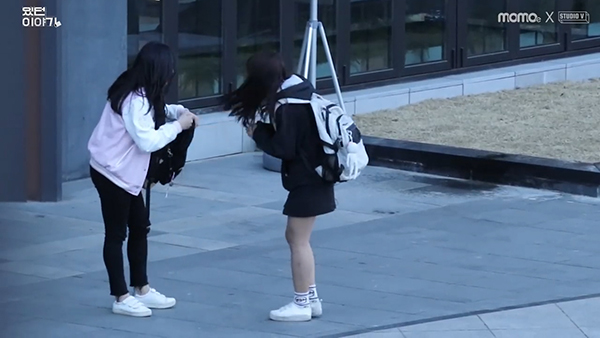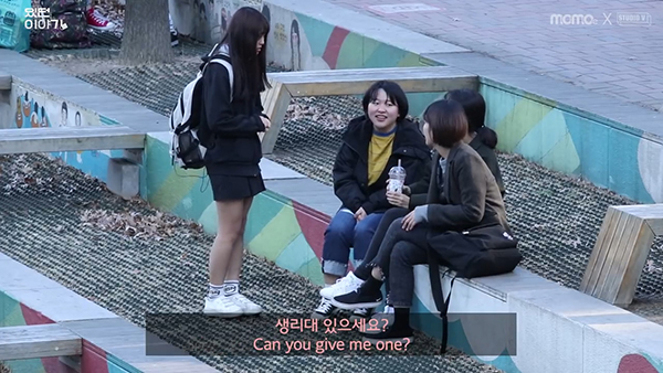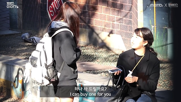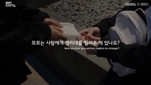 EBS의 모바일 콘텐츠 브랜드인 ‘MOMOe’ 유튜브 채널에 올라온 실험영상 속 한 장면입니다. 실험에 참가한 여자 중학생이, 일반 여성들에게 생리대를 빌리는 콘셉트입니다.