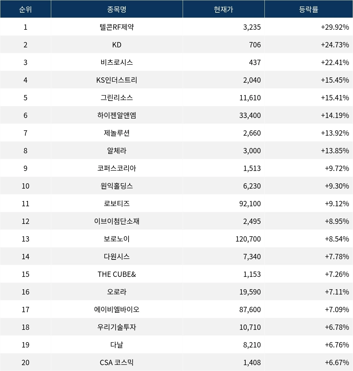 6위 하이젠알앤엠(160190)은 현재가 33,400원으로 14.19% 급등 중이다. 7위 제놀루션(225220)은 현재가 2,660원으로 13.92% 급등 중이다. 8위 알체라(347860)는 현재가 3,000원으로 13.85% 급등 중이다. 9위 코퍼스코리아(322780)는 현재가 1,513원으로 9.72% 상승 중이다. 10위 원익홀딩스(030530)는 현재가 6,230원으로 9.30% 상승 중이다.
