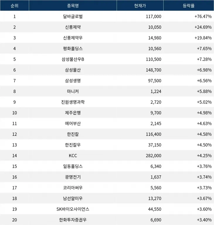 이어 상승률 2위 신풍제약(019170)은 현재가 10,050원으로 주가가 24.69% 폭등하고 있다. 상승률 3위 신풍제약우(019175)는 현재 14,980원으로 19.84% 급등하며 두각을 나타내고 있다. 상승률 4위 평화홀딩스(010770)는 7.65% 상승하며 10,560원에 거래되고 있다. 상승률 5위 삼성물산우B(02826K)는 7.28%의 상승세를 타고 110,500원에 거래되고 있다.
