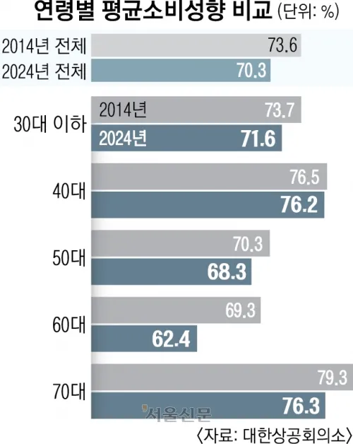 지난 10년 동안 우리 사회 전 연령대에서 ‘평균소비성향’이 일제히 하락한 것으로 나타났다. 특히 60대는 노후와 주거 부담 때문에, 20·30대는 실제 소득 감소로 인해 지출을 줄였으며 전반적인 소비 습관의 변화도 주요 원인으로 지목됐다. 대한상공회의소가 1일 발간한 ‘세대별 소비성향 변화와 시사점’ 보고서에 따르면 2024년 가계의 평균소비성향은 70.3%로 10년 전인 2014년(73.6%)보다 3.3% 포인트 낮아졌다. 평균소비성향이란 가계가 가처분소득 중 실제로 소비에 지출한 비율을 의미한다.