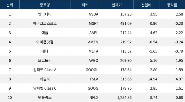 엔비디아는 2.58% 상승하며 157.25달러에 거래를 마쳤다. 애플 또한 2.22%의 상승률을 기록하며 212.44달러에 마감했다. 브로드컴은 1.95% 오르며 269.90달러에 거래를 마감했다.
