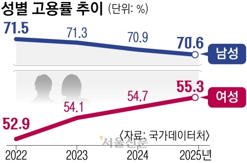 18일 국가데이터처 ‘경제활동인구조사’에 따르면 남성 고용률은 2022년 71.5%에서 2025년 70.6%로 하락했다. 반면 같은 기간 여성 고용률은 52.9%에서 55.3%로 상승했다. 아직 고용률 자체는 남성이 더 높지만 최근 추세로는 여성의 고용시장 진입이 활발해지고 있는 것이다.