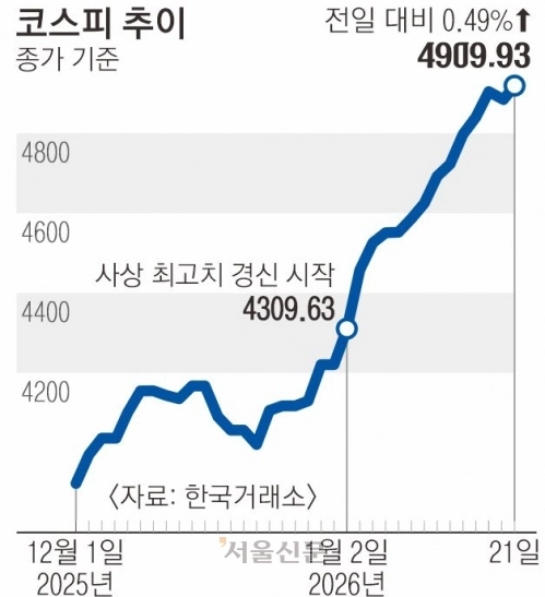 21일 한국거래소에 따르면 코스피는 전 거래일 대비 24.18포인트(0.49%) 오른 4909.93에 마감했다. 종가 기준 최고치다. 지수는 장 초반 도널드 트럼프 미국 대통령의 ‘그린란드 관세’ 압박으로 미·유럽 무역 갈등 우려가 부각되며 4807.13까지 밀렸지만, 오후 들어 반등에 성공했다. 유가증권시장에서 외국인은 4394억원, 기관은 3219억원을 각각 순매수하며 지수를 끌어올렸고 개인은 9965억원을 순매도했다.