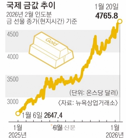 주식시장이 변동성에 노출된 사이, 국제 금값은 안전자산 선호가 강화되며 급등했다. 20일(현지시간) 뉴욕상업거래소에서 2월 인도분 금 선물 가격은 온스당 4765.8달러로 마감해 사상 최고치를 경신했다. 미·유럽 간 갈등이 장기화할 수 있다는 우려가 커지면서 위험자산 회피 심리가 금 시장으로 쏠린 영향으로 풀이된다.