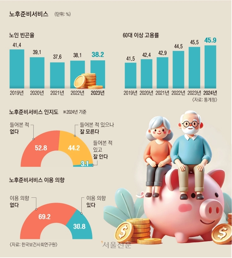 가장 큰 걸림돌은 낮은 인지도다. 노후준비서비스 인지율은 지난해 3.1%로 5년 전과 비슷하다. 서비스 이용 의향은 30.8%에 이르지만, 실제 상담으로 이어지는 경우는 드물다.