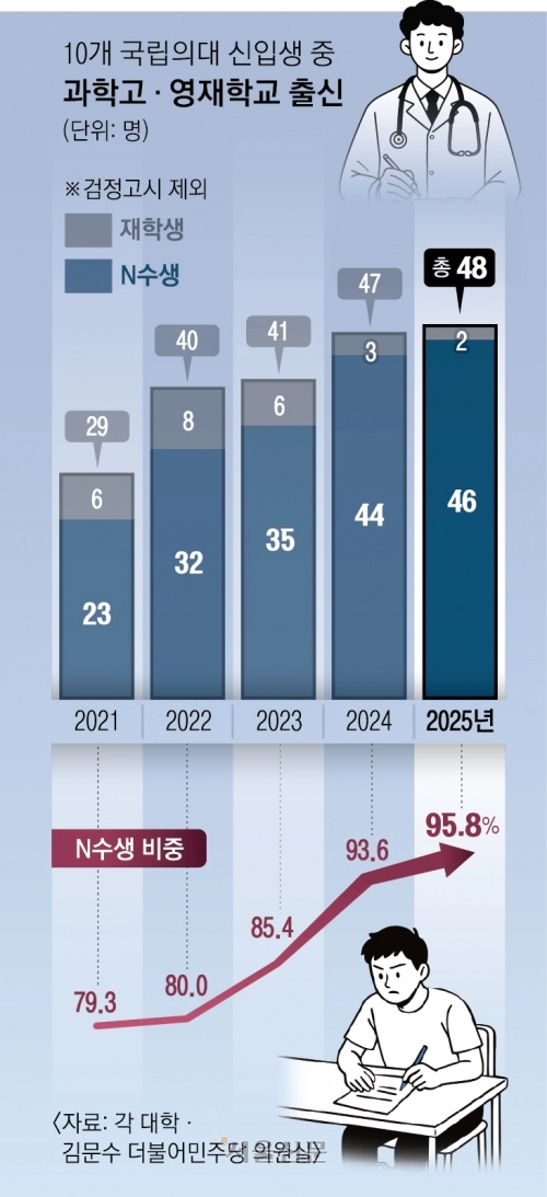 실제 영재학교·과학고 학생들이 N수를 거쳐 의대에 진학하는 숫자는 증가세다. 서울신문이 이날 김문수 더불어민주당 의원실을 통해 입수한 ‘최근 5년간 영재학교·과학고 출신의 10개 국립의대 신입생 현황’에 따르면, 의대에 입학한 영재·과학고 학생 중 N수생은 2021년 23명, 2022년 32명, 2023년 35명, 2024년 44명, 2025년 46명으로 5년 연속 증가했고, 4년만에 2배가 됐다. 과학고에서는 N수생이 5년간 109명, 영재학교는 71명이 국립대 의대로 향했다. N수생 비중도 2021년 79.3%에서 2025년 95.8%로 크게 올랐다.