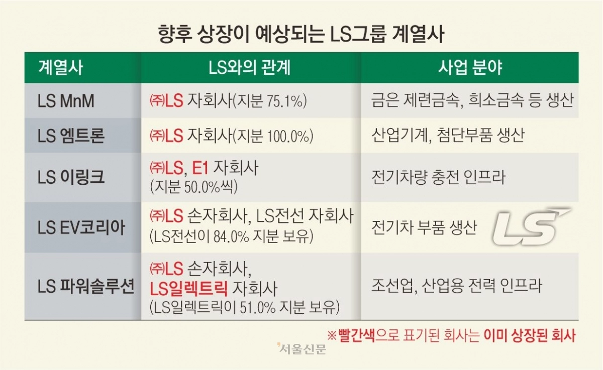 12일 증권업계에 따르면 LS는 제련금속과 희소금속을 생산하는 LS MnM, 전기차용 고전압 커넥터 업체인 LS EV코리아, 산업기계·첨단부품 기업인 LS엠트론 등의 상장을 검토하고 있다.