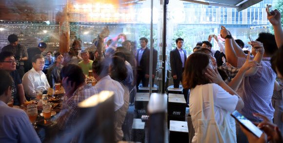 맥줏집에 대통령이 나타났다문재인 대통령이 26일 오후 서울 광화문 인근 한 맥줏집에서 퇴근길 시민들과 만나 호프타임을 갖는 동안 시민들이 몰려 지켜보고 있다. 이 날 행사는 대통령 후보 시절 약속한 ‘퇴근길 국민과의 대화 일환’으로 열렸다. 대화 자리에는 박용만 대한상의회장과 청년 구직자, 경력단절 여성구직자. 최저임금 적용 근로자(아파트 경비원) 중소기업 대표, 편의점 점주, 서점, 음식점, 도시락업체 대표, 인근 직장인이 참석했다. 2018.7.26