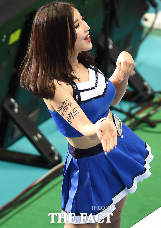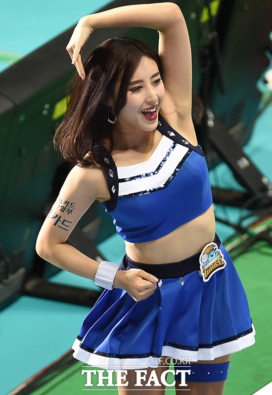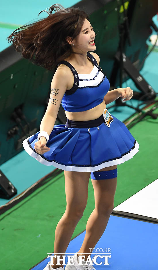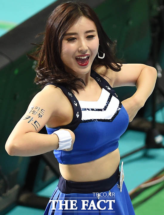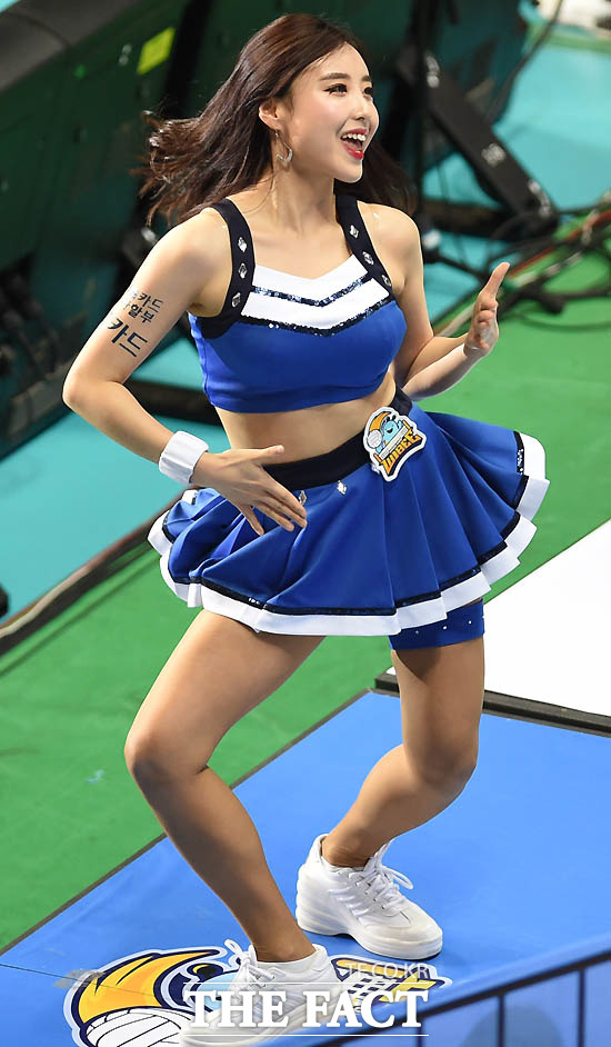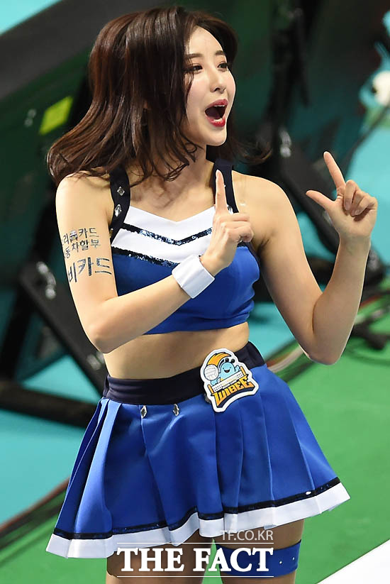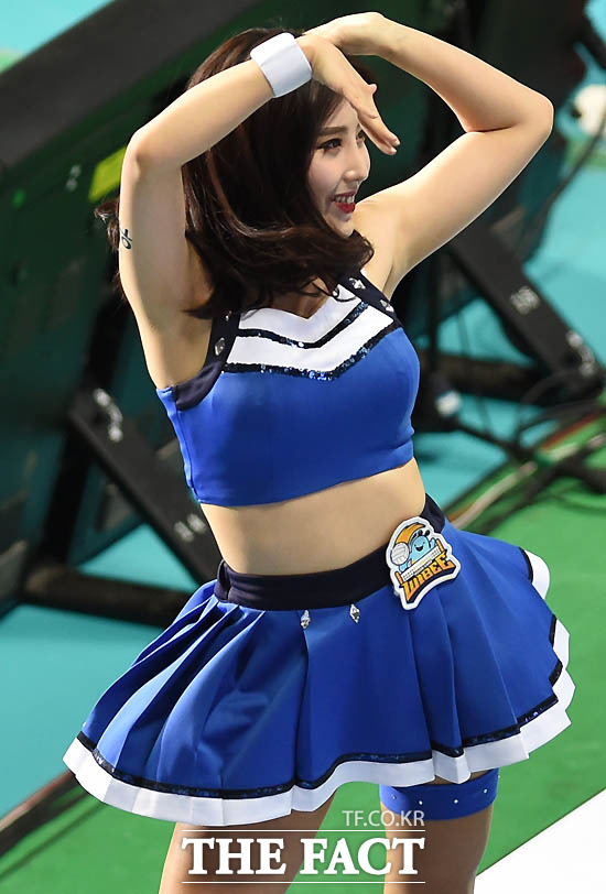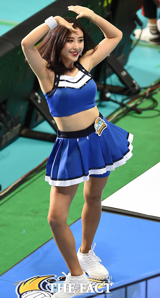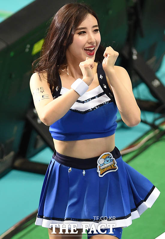3일 오후 서울 장충체육관에서 열린 ‘NH농협 2016~2017 프로배구 V-리그’ 우리카드와 OK저축은행의 경기에서 우리카드 치어리더가 깜찍한 애교와 앙증맞은 댄스를 선보이며 배구장을 찾은 팬들 앞에서 자신의 매력을 발산하고 있다.